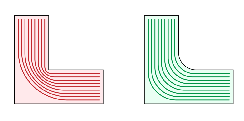 When a load passes through a part, the forces follow paths through the material. Sharp inside corners abruptly disrupt these paths, forcing stresses to concentrate at a single point and increasing the risk of crack initiation. Add a chamfer or fillet where walls meet the base of a part to smooth the transition for load paths, allowing forces to flow gradually from vertical to horizontal sections. This reduces stress concentrations at the wall–base junction, keeps stresses aligned with stronger print directions, and minimizes weak points caused by sudden changes in extrusion path geometry.