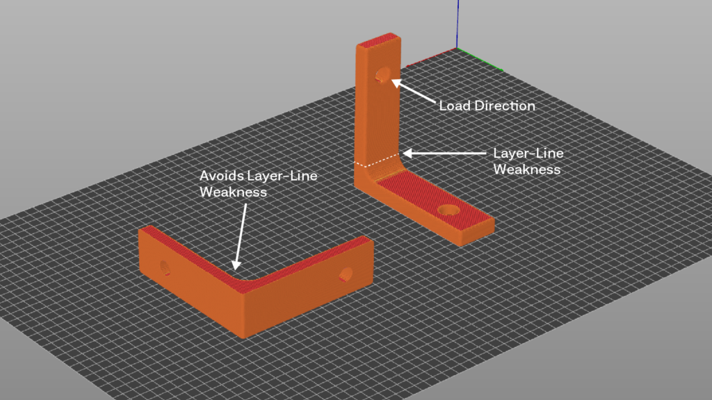 It is well known that material extrusion parts are weakest along the layer lines, so choosing a proper printing orientation is one of the most basic steps to increasing part strength. Before you begin designing, you should consider the direction of load forces. Load forces should be aligned parallel to the print surface.